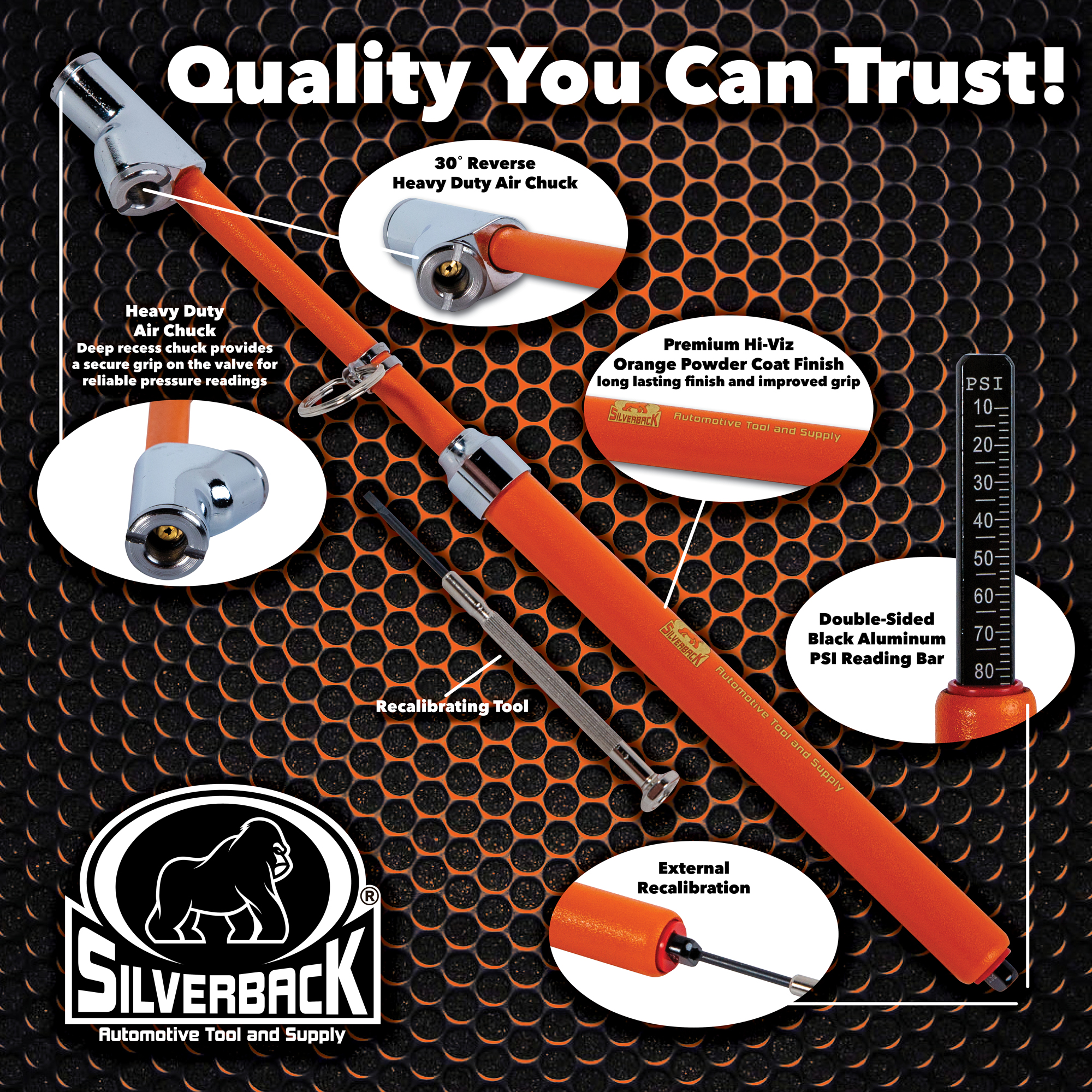 Silverback Automotive Tire Gauges are designed with accuracy, durability and quality for the automotive professional in mind. The Silverback gauges are produced by a third generation, family owned business specializing in air gauges and inflator gauges. Once you have the opportunity to hold one of these air gauges in your hand you will immediately know you are holding a tool for the professional. These well balanced mechanical gauges are made of the highest quality nickel and brass materials with a premium chrome finish. But it's what's inside the gauges and the care in the production process that makes them special. Highly polished barrels, precision internal springs, proprietary lubrication and other high quality components, all work together to produce a gauge that is extremely accurate throughout a wide span of PSI. Every gauge is tested at three different PSI points for accuracy before leaving the factory. Safety-Performance-Tire Life; Maintaining proper tire pressure reduces the risk of tire failure, improves vehicle handling, improves fuel economy, and increases the life of your tires.